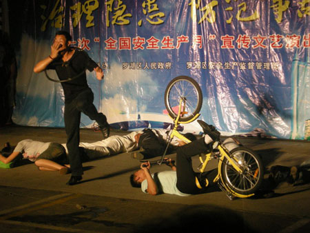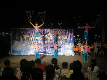 演出荟萃了杂技、相声、歌曲、小品、快板等通俗易懂且为广大社区居民所喜闻乐见的艺术形式和节目,上演了转碟表演《五彩缤纷》、相声《安全生产重于泰山》、蹬技、快板、杂技 《高车停碗》、歌曲《你到底爱谁》、柔术《滚灯》、小品《交通法规》、快乐女孩抖灯图等精彩节目。