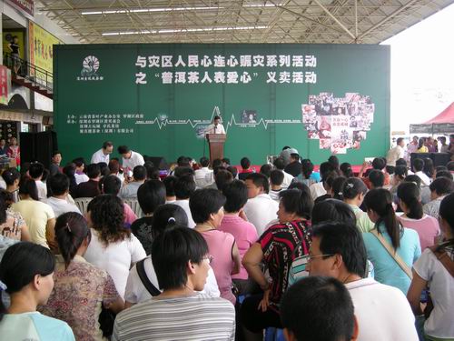 为继续帮助灾区人民克服困难,战胜灾害,恢复生产,重建家园。由云南省茶叶产业办公室主办、罗湖区黄贝商会、深圳古玩城与聚真楼茶业(深圳)有限公司承办的“与灾区人民心连心”之普洱茶人表爱心义卖活动,将于6月21日下午三点在深圳古玩城市文化舞台举行,希望能以此为抗震救灾这项长期而艰巨的工作做出自己应有的贡献。