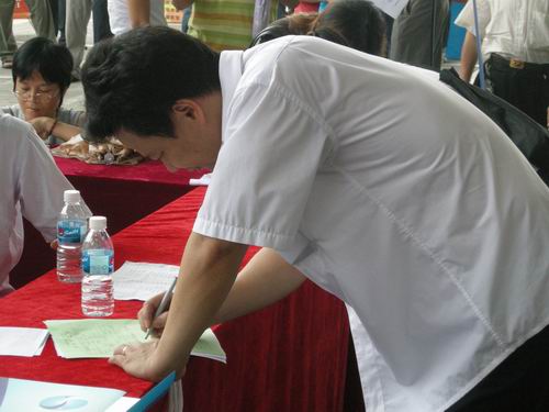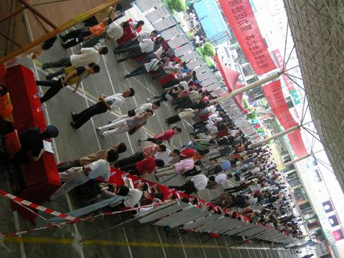 在招聘会现场,前来求职人员不断增加,他们在与用工企业互相了解并确定后,可当场签定录用意向书,其中就有两对来自四川灾区的居民当场与用人企业签定了录用意向书,他们都是刚到深圳不久,对能及时找到工作很高兴,对政府提供给他们的优惠政策表示感激。
