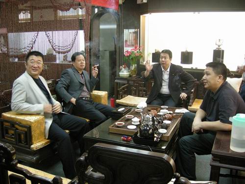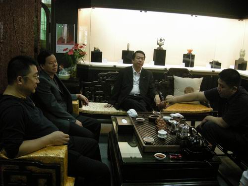 在卓玉馆,卓志强一行与深圳古玩城董事长卓少东一同品茶聊天,卓志强、李贤谋先后对卓少东能有如此大规模的私人收藏玉馆表示惊讶及赞赏,该馆馆长王跃庆同时也重点介绍了卓玉馆与北京故宫即将联合推出发行的书籍《紫光玉照》。