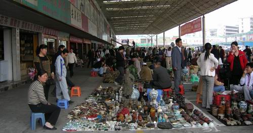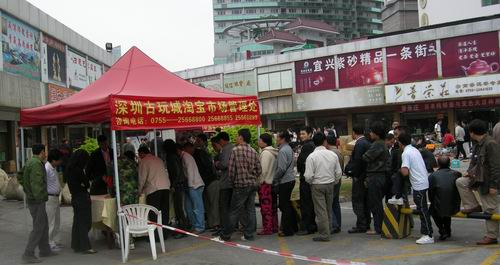 近日,在深圳古玩城淘宝市场上呈现出一派繁荣兴盛的景象,2万平米的地方堆满了各种琳琅满目的商品,玉器、奇石、石雕、牙雕、古钟表等古玩杂件应有尽有让人眼花缭乱。整个淘宝市场人头颤动,前来参观购买的人更是接二连三。在广场一角,淘宝市场管理处门前更是排起了长龙,这些都是淘宝市场的商户们,他们争先预定着下周双休日的摊位,并不断的有人加入到长龙中来。