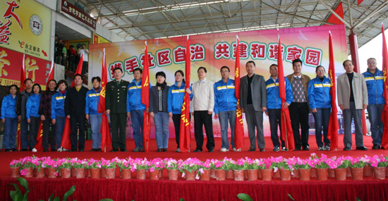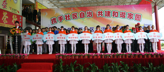 此次活动,得到了黄贝社区各部门领导、各社区居民的热烈响应。黄贝辖区“社区部队”“社区文化队”“社区党委组织队”“物业管理队”“四点半学校队”“治安义务巡逻队”等十二支社区自治队伍集体亮相,它们今后将在社区中扮演不同的角色,从物业、治安、维权、城市美化、协老等方面优化社区环境,把城乡社区建设成为文明祥和、管理有序、服务完善的和谐社会生活共同体。由罗湖区委常委、组织部部长吴裕中对十二支队伍分别进行了郑重的授旗仪式,全场观众一片沸腾、欢呼雀跃。