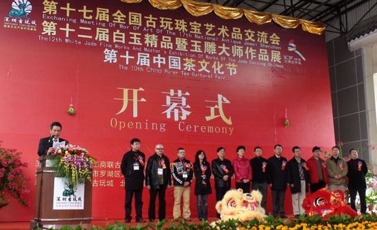 11月19日上午,深圳古玩城锣鼓声声,人头攒动,彩带飘飘,花海一片,为期五天的“第十七届全国古玩珠宝艺术品交流会、第十二届白玉精品暨玉雕大师作品会、第十届中国茶文化节”开幕式在这里隆重举行。