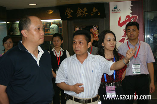 5月16日下午,汕尾市市长郑雁雄来到深圳古玩城分会场,在深圳古玩城董事长卓少东的陪同下,参观了广场展区、古玩城精品区、王锡良等泰斗级中国百名陶艺名家精品展、寿山石精品店、苏派玉雕大师精品展、倪顺生大师紫砂壶作品展、钱雪梅大师紫砂作品展和卓玉馆藏品展。郑市长感慨地说:久闻深圳古玩城规模大、精品多、档次高,果然如此,实在是不虚此行。