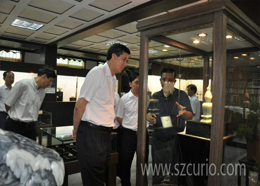随后,周林祥书记一行在深圳古玩城董事长卓少东的陪同下,参观了卓氏茶坊、百花艺都、同寿友精品寿山石、陶玉文化城、华夏遗珍、卓玉馆、海外文物回流区和淘宝市场,周祥林书记对古玩城的发展和成绩表示肯定和赞赏,并鼓励深圳古玩城继续做大做强。
