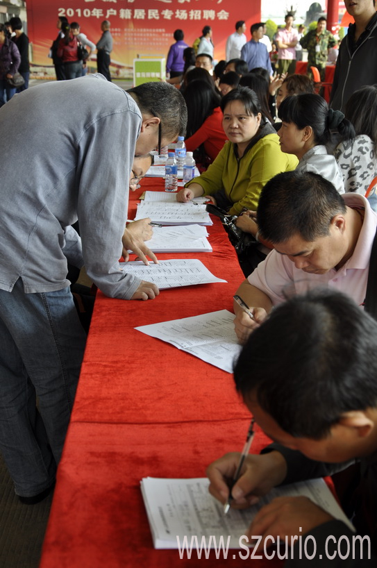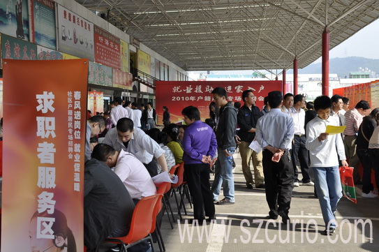 春风送岗位,就业促温暖。今天上午,由深圳市人力资源和社会保障局主办,深圳市劳动就业服务中心、罗湖区劳动局、罗湖区黄贝街道办、深圳古玩城协办的“就业援助,进家入户 2010年户籍居民专场招聘会”在深圳古玩城淘宝广场举行。此次招聘会属于黄贝街道大型公益性招聘会,来自深圳各区的近四十多家公司提供了四百多个就业岗位,其中不乏维也纳酒店集团、沃尔玛等知名企业,现场还设置了求职者服务区、政策咨询处,帮助求职者多渠道实现再就业。