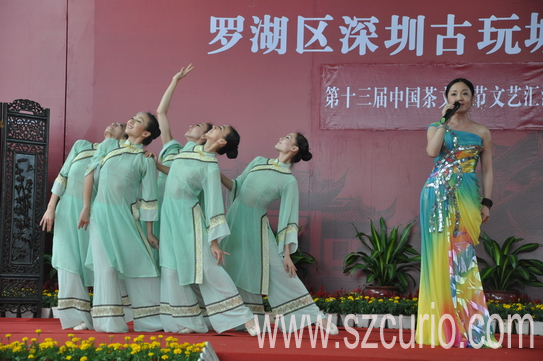 在欣赏优雅茶艺的同时,主办方深圳古玩城还邀请了广州歌舞团和青年歌唱家刘艳表演《茶韵》、《请喝一杯客家茶》等精彩节目。本届文博会深圳古玩城分会场同步举办第十三届中国茶文化节,推出中国十大名茶展,大红袍、金骏眉、台湾高山茶、酵素茶、普洱茶、黑茶等,以集中展示、免费品茗的方式,为爱茶之人提供更丰富的选择。正可谓:茶香歌里走,惬意舞中生。