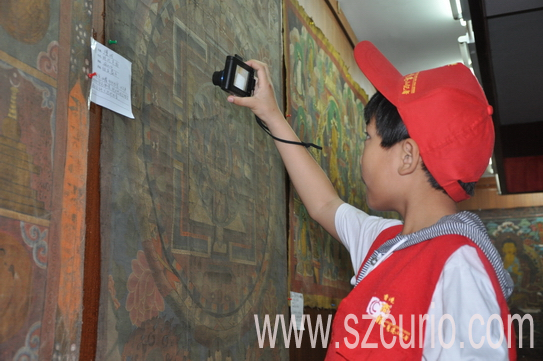小记者正在拍摄古代唐卡