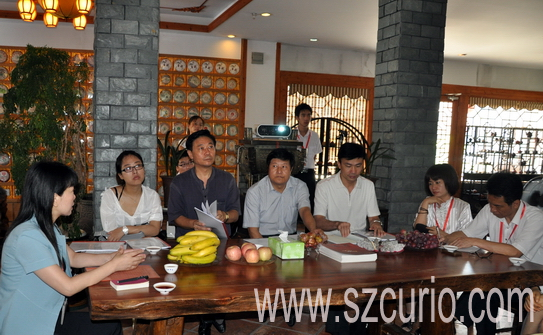 2011年7月27日上午十时,“深圳市重点文化企业认证-深圳古玩城评审会” 在卓氏茶坊正式召开。深圳市人民政府文化产业办公室领导、专家一行5人出席了会议,公司总经理林金辉、执行董事杜豆豆、运营副总杨锐锋、物业副总王赟、财务经理肖冰陪同参加会议。