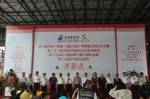 5月17日上午,第八届文博会深圳古玩城分会场以第一笔33亿的成交额在深圳古玩城多功能舞台隆重开幕。国家文化部文化产业司司长刘玉珠,深圳市人大常委会常务副主任、深圳市委委员谭国箱,中国白玉研究会会长、北京西单天安天地国际珠宝城市场有限公司总策划、北京天宝润德古玩文物艺术会展中心有限公司董事长赵津生,罗湖区委书记、区人大主任倪泽望,罗湖区委常委、常务副区长张斌、中国工艺美术大师、中国宝玉石协会常务理事吴德昇,深圳市雅诺信集团董事长卢礼杭等领导和嘉宾出席了此次开幕式。