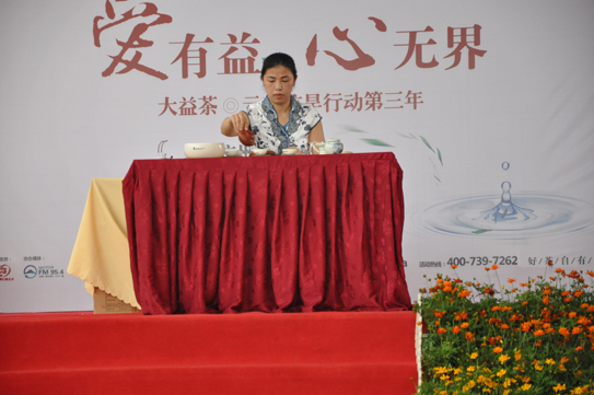 活动通过古筝演奏《青花瓷》、《知音》,女声独唱《感恩的心》,《大益八式》茶艺表演,男声独唱《爱是你我》,以及茶舞表演《浮梁茶艺》等来传递爱心,演绎茶文化。(李敏双)