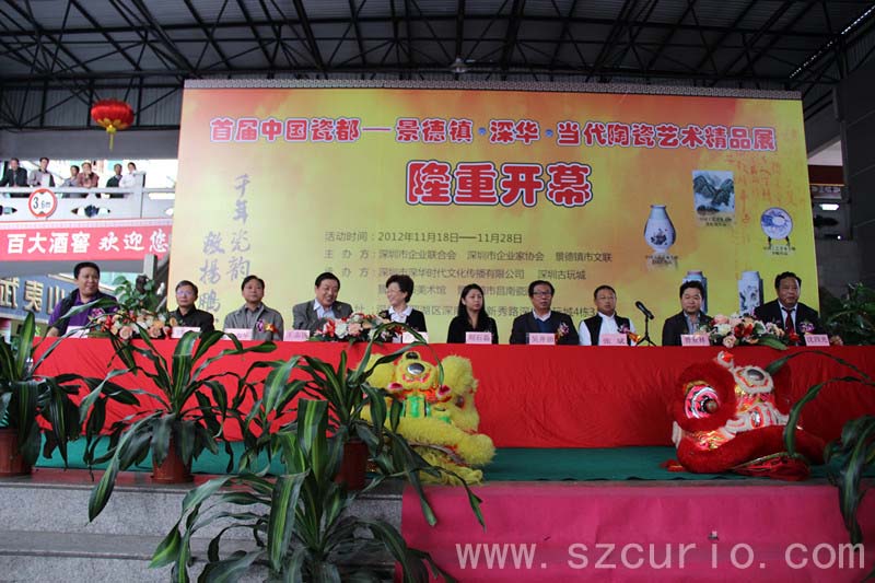 开幕式上罗湖区委常委、宣传部长刘石磊围绕“十八大”精神代表区政府讲话,充分肯定深圳古玩城在文化产业发展诗篇上的努力以及景德镇陶瓷文化高度发展的华章,同时高度赞扬了深圳古玩城举办一年两届交流会产生的巨大经济效益和社会效益,并对此次景德镇陶瓷展送上了圆满的祝福。深圳市企业联合会、企业家协会执行会长吴井田也针对此节陶瓷展发表讲话,预祝陶瓷展取得圆满成功。景德镇市文联主席余志华,景德镇陶瓷学院副教授、科研校产处副处长郭立也相继对陶瓷、陶瓷文化进行讲话,在介绍景德镇陶瓷文化发展史的基础上,介绍此届陶瓷展各名师名作,并给与深圳古玩城陶玉文化城高度的评价。