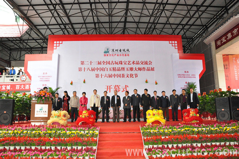 11月24日上午,由全国工商联古玩业商会中国白玉研究会、中华古玩城联盟主办,深圳市罗湖区人民政府、深圳市文体旅游局支持,深圳市罗湖区宣传部(文体局)、深圳市罗湖区黄贝街道办事处协办,深圳古玩城和北京华夏遗珍文物公司承办的第二十三届全国古玩节暨珠宝艺术品交流会、第十八届白玉精品暨玉雕大师作品展、第十六届中国茶文化节在深圳古玩城多功能文化舞台盛大开幕。深圳市政协主席白天、深圳市人大常委会常务副主任、深圳市委委员谭国箱、罗湖区委书记、区人大主任倪泽望、罗湖区人民政府区长贺海涛、罗湖区委常委、宣传部部长刘石磊、罗湖区委常委、常务副区长张斌、罗湖区政协主席周向阳等领导出席了开幕式。深圳市政协主席白天宣布了第二十三届全国古玩珠宝艺术品交流会开幕。
