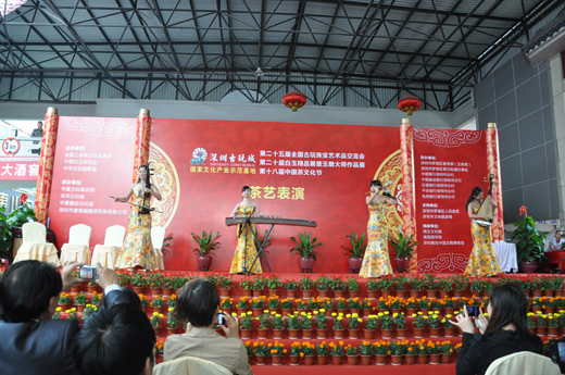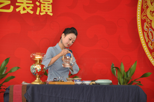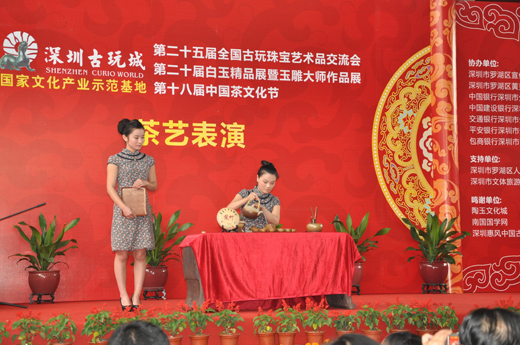 21日下午,第十八届中国茶文化节系列活动之“茶可行道,亦可雅志——五大名茶茶艺表演”在深圳古玩城隆重举行,来自中国茶业、紫竹茶业、高山茶、彭福号茶业的高级茶艺师们为大家献上了精湛的茶艺表演,深圳雍和艺传统女子民乐坊现场演奏古筝、琵琶、葫芦丝、长笛、二胡等传统民乐器,可谓是清歌流韵,茶香四溢。更有观众喜爱的民俗文化长嘴铜壶茶艺、相声表演、孔雀舞等,博得了现场观众的阵阵掌声。