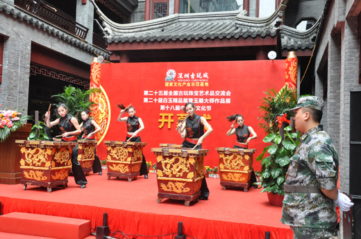 开幕式在浑厚有力的击缶声中拉开帷幕,奥运黄金缶,以古典的意蕴、澎湃的节奏,向现场的来宾传递着华夏文明的生机勃勃,传递着深圳古玩城对五湖四海来宾最真挚的欢迎之情!开幕式上,深圳古玩城总经理魏总发表了热情洋溢的欢迎辞,让各位来宾感受到了深圳古玩城文化创新的发展理念,也感受到了深圳古玩城热情好客的人文情怀。北京古玩城董事长尉棋先生、中国建设银行深圳分行小企业部副总经理谢永坚先生分别发表精彩讲话,对深圳古玩城十年举办24届交流会的盛举大加赞赏,并表示非常乐意与深圳古玩城展开更多更广泛的合作,开创更加美好的未来。