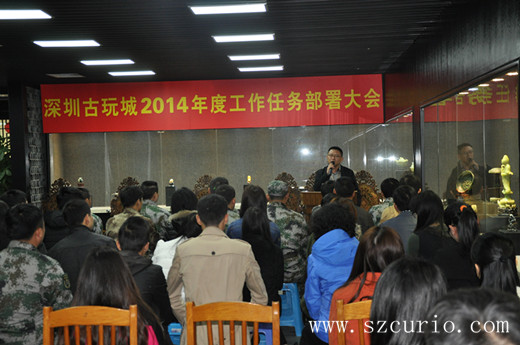 深圳古玩城总经理魏强在大会上作了2013年工作总结报告和2014年工作任务部署。他简要回顾了深圳古玩城十二年的发展历程,全体员工一路走来,一路艰辛,一路希望、荣誉与共。深圳古玩城作为古玩城全国战略布局和发展的“窗口”和“试验田”,在过去的一年,继续承担着“探索”与“创新”商业模式的使命,推动着深圳古玩城项目成为公司各外地项目复制和借鉴的典范,成功打造位于北京的华夏古玩城、位于深汕合作区的珠宝产业园、位于汕尾的内湖农批等项目。在肯定成绩的同时,我们也要清醒的认识到在市场招商业务的创新、在精细运营管理的推行、在项目开发建设的效率等方面,还有很大改进和提升空间。新的一年,是“大品牌、大建设、大运营”的关键一年,面临着“承前启后、继往开来”的机遇与挑战。希望全体同仁要有独当一面的自信、要有迎接各种挑战的勇气、要有冲破一切困难的意志、要有迈向卓越的执行,让深圳古玩城成为古玩城品牌名副其实的标杆与先锋。2014年,我们必须扬鞭奋蹄,闯关破障,实现目标,迎接胜利!