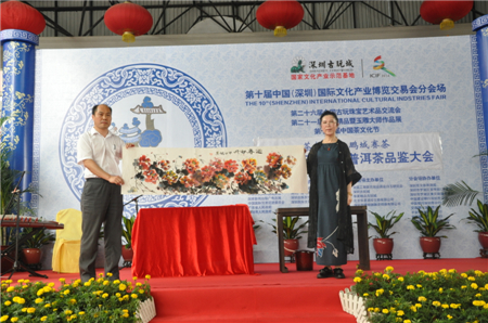 深圳市普洱茶研究会秘书长陈勇、深圳古玩城执行董事杜豆豆分别为获奖者颁发了奖牌和荣誉证书。品鉴会现场还邀请了中国工艺美术家协会会员、辽宁美术家协会会员何月老师现场泼墨助兴,以一副《迎春牡丹图》为本届普洱茶品鉴会添上浓墨重彩的一笔。