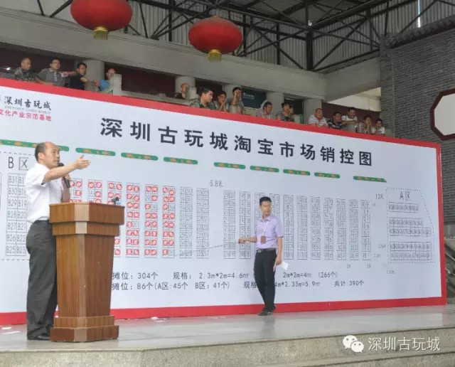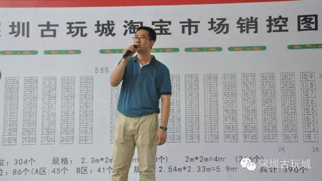 深圳古玩城常务副总马总讲话 本次拍卖本着公平、公正、公开的原则,现场竞拍,价高者得。拍卖现场竞争激烈但秩序井然。 随着古玩行业的逐步成熟,深圳古玩城这一黄金宝地得到越来越多的商家认可。来自东莞的邹先生经营古玩杂项多年,听朋友说深圳古玩城举行淘宝摊位拍卖,特地赶来参加!其中154号铺位的拍卖价格达到450元,是本场拍卖会的最高拍价,深圳古玩城淘宝广场深受广大商家的追捧! 深圳古玩城近十年的古玩交易淘宝市场每逢双休日和公共节假日举行。每逢开市,人头攒动,吸引了众多港澳台顾客、市民和游客。深圳古玩城淘宝广场,俨然成为众多淘宝爱好者的交流平台,成为深圳市民的文化休闲胜地,同时也吸引了众多社会知名人士来古玩城淘宝集市淘宝收藏,如著名演员潘长江、著名相声表演艺术家侯耀华等。