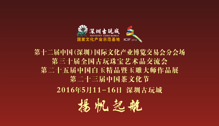 2016年第十二届文博会深圳古玩城分会场将于5月11日盛大开幕在为期6天的活动中,深圳古玩城分会场以“日月为明,知行合一”为主题,以郑和下西洋开辟海上丝绸之路为切入点,以瓷器、茶、书、画、玉石等文化元素为主线,将“一带一路”融汇其中。