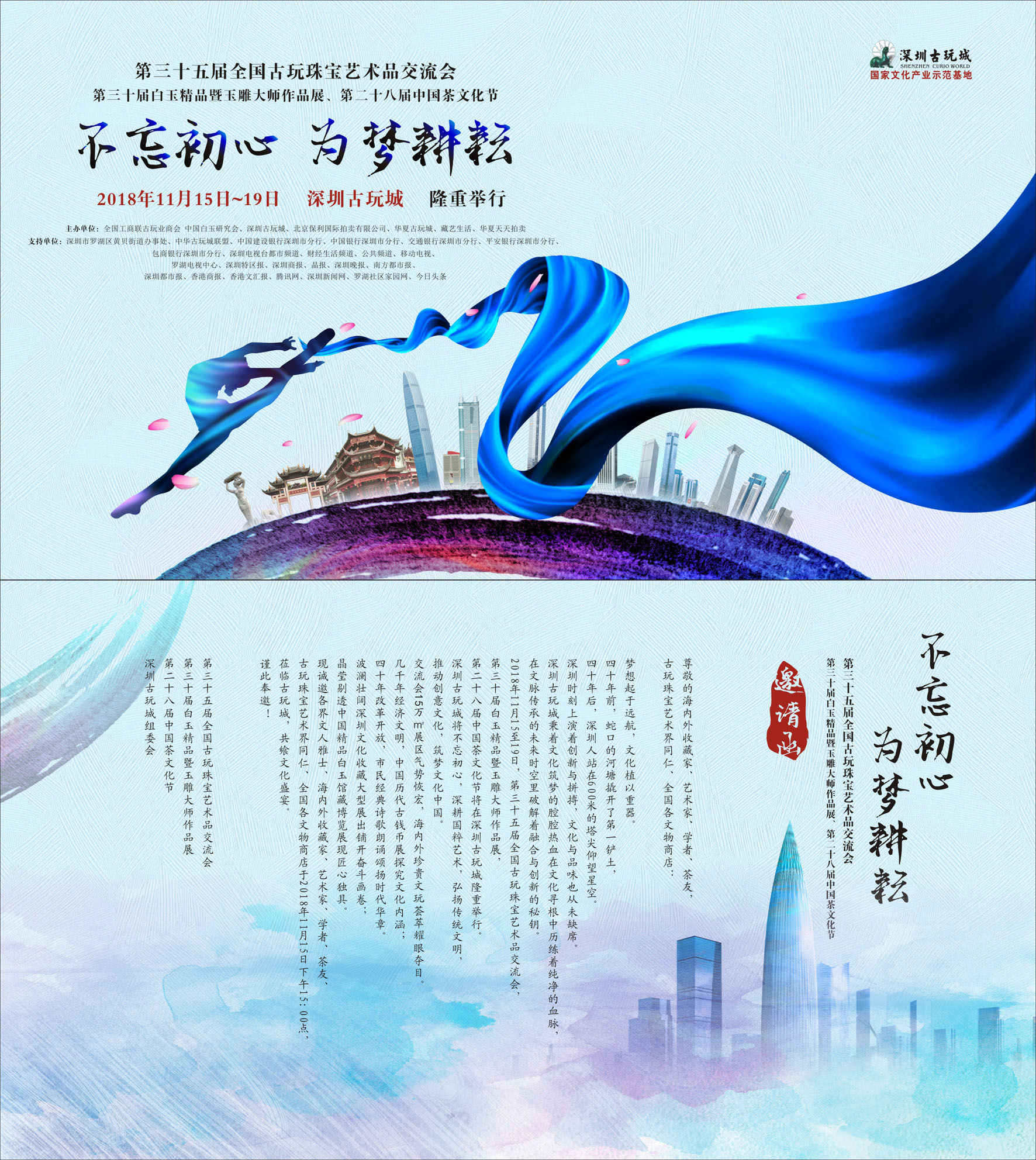 2018年11月15至19日,第三十五届全国古玩珠宝艺术品交流会,第三十届白玉精品暨玉雕大师作品展,第二十八届中国茶文化节将在深圳古玩城隆重举行。深圳古玩城将不忘初心,深耕国粹艺术,弘扬传统文明,推动创意文化,筑梦文化中国。