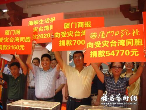 由于台湾近期遭受“莫拉克”台风侵袭,不少台湾民众仍然处于缺粮、缺水、无医无药的状况。鉴于此,大赛组委会联合厦门市红十字会在启动仪式上举行了为台湾风灾捐款活动,在场嘉宾、摄影爱好者和游客纷纷慷慨解囊,厦门日报社领导也将募集的善款委托厦门市红十字会转交台湾有关方面。同时组委会选取去年“两门互拍”摄影活动中厦门摄影师林世泽与金门摄影师蔡显国各5幅精品佳作,计划在未来三天时间里展开义卖,义卖所得款项将全部捐献给台湾灾区。