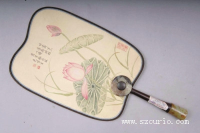 乾隆帝绘荷花图并书恭奉皇太后御园赏荷诗木柄团扇