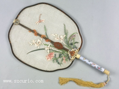 象牙编织嵌象牙染雕兰菊图画珐琅柄扇