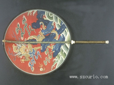 红色缂丝海水云龙图金漆嵌象牙柄团扇