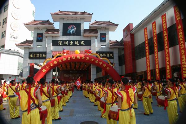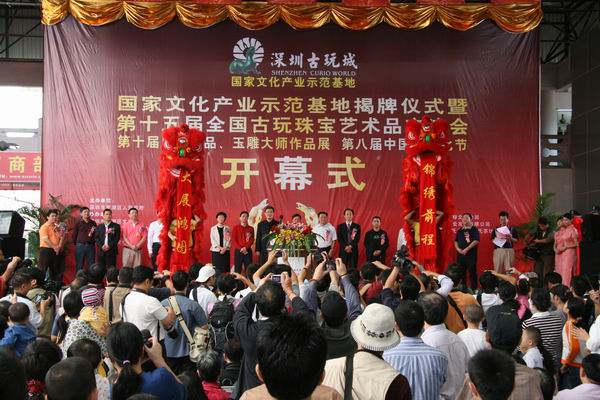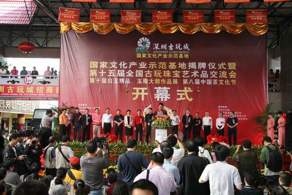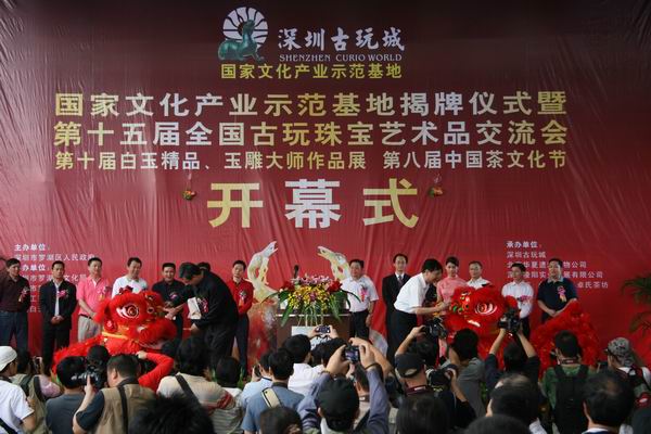 由罗湖区政府主办,深圳市罗湖区文化局、深圳市罗湖区黄贝街道办事处、全国工商联古玩业商会、中国白玉研究会协办,深圳古玩城、北京华夏遗珍文物有限公司、深圳凌阳实业发展有限公司、卓玉馆、卓氏画院、卓氏茶坊承办的深圳古玩城国家文化产业示范几次揭牌仪式暨第十五届全国古玩珠宝艺术品交流会盛大开幕,故宫博物院专家张广文、吕成龙,深圳市人大副主任汤锦森、深圳市文产办副主任钟荫腾、深圳市罗湖区副书记、区长鲁毅、深圳市罗湖区区委常委、组织部部长吴裕中、深圳市罗湖区政府副区长康雅丽、深圳古玩城董事长卓少东以及罗湖区黄贝街道、罗湖区文产办等企事业单位领导出席了开幕式。